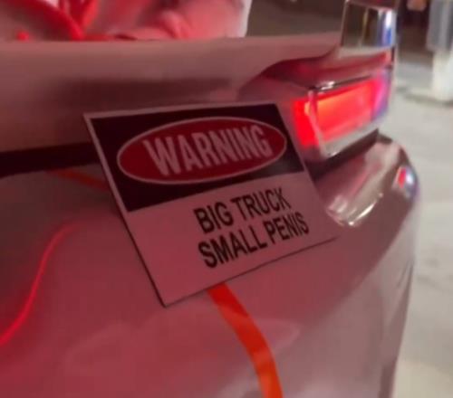 球迷在米切罗卡车上贴贴纸,贴纸内容为:“大卡车,小JJ”